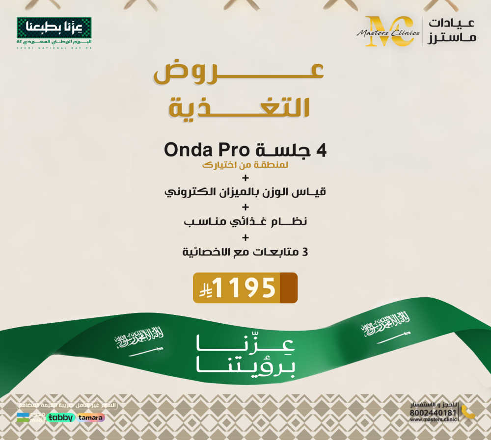 3 جلسات متابع مع اخصائية التغذية + قياس مفصل للوزن (الميزان الكتروني) + نظام غذائي مناسب + 4 جلسات بجهاز اوندا برو (Onda Pro) لمنطقة من اختيارك