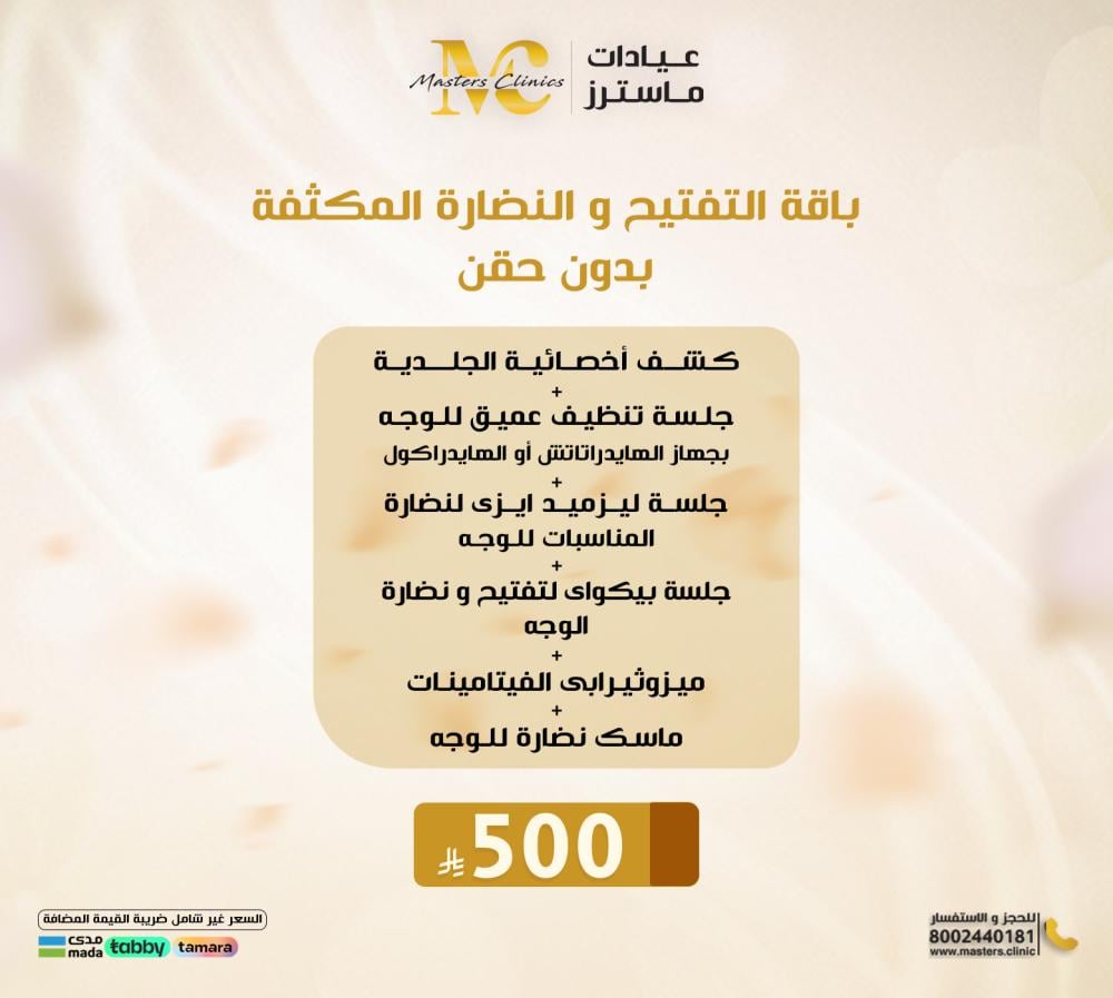 كشف أخصائية الجلدية+جلسة بيكواى لتفتيح و نضارة الوجه+جلسة ليزميد ايزى لنضارة المناسبات للوجه+جلسة تنظيف عميق للوجه بجهاز الهايدراتاتش أو الهايدراكول+ميزوثيرابى الفيتامينات+ماسك نضارة للوجه