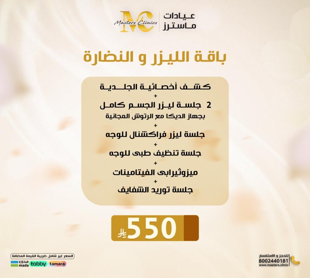 كشف أخصائية الجلدية+2 جلسة ليزر الجسم كامل بجهاز الديكا مع الرتوش المجانية+جلسة ليزر فراكشنال للوجه+جلسة توريد الشفايف+جلسة تنظيف طبى للوجه+ميزوثيرابى الفيتامينات